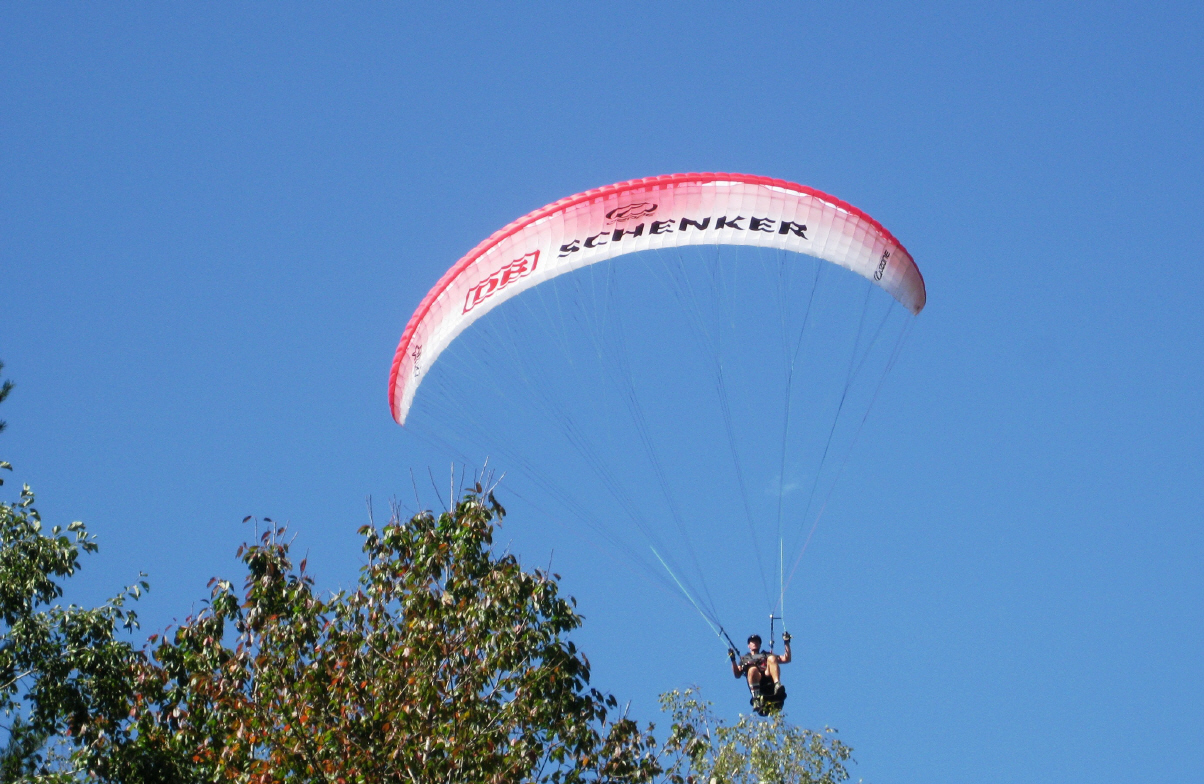 Nach ca. 30 sec. Flugzeit bin ich auf die Idee gekommen meinen Beschleuniger zu treten, weil ich gesehen hatte, dass ich diese Flugstrecke voll Beschleunigt schaffen würde. Als ich nun den Beschleuniger betätigte, spürte ich einen kurzen Widerstand, bevor ich dieses ungute Geräusch in meinen Ohren wahrnahm. Dieses Geräusch war der Klettverschluss meines Retters. Irgendwie muss beim Ein -bzw. Ausdrehen mein Beschleunigungsseil über dem Retter gekommen sein, und danach habe ich durch das treten des Beschleunigers mein Rettungsgerät unbeabsichtigt ausgelöst. Was danach kam, war alles andere als lustig. Mein Blick nach unten, natürlich konnte ich es nicht glauben, aber er war draußen! Bevor ich es richtig begreifen konnte, füllte sich der Retter mit Luft und dann ging es nur noch senkrecht bergab. Ich zog noch schnell an den B-Leinen des Hauptschirmes, um die Pendelbewegung so gering wie möglich zu halten und dann saß ich auch schon in einer Baumkrone.
