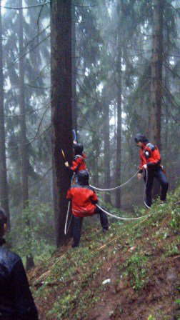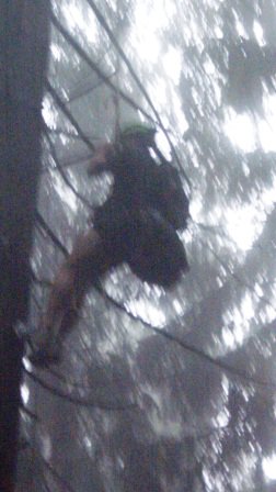 Aber der Aufstieg gestaltete sich extrem schwierig, weil der Baum unten keine brauchbaren Äste zum befestigen der Sicherungen hatte und auch durch den Regen sehr rutschig war.