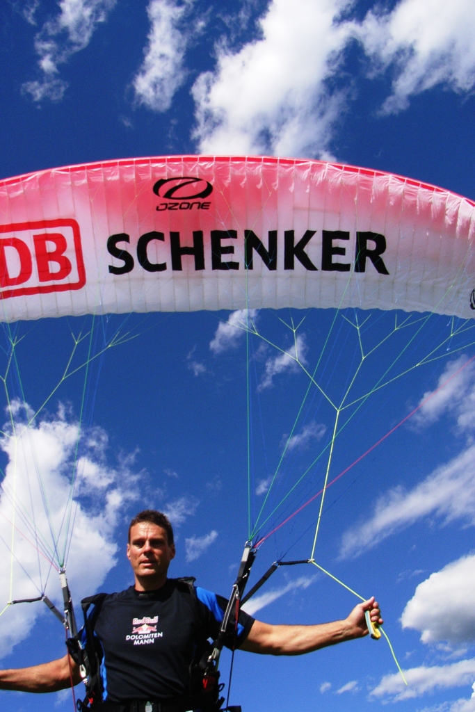 Am 11.09. habe ich dank meines Sponsors beim Dolomitenmann mit meinem neuen Schirm teilgenommen. Ich konnte mich um 8min. gegenüber dem Vorjahr verbessern. Leider sind mir 2 grobe Fehler unterlaufen: Erstens bin ich nicht auf die richtige Landewiese gekommen, weil ich den Schirm zu wenig Probefliegen konnte, und der zweite grobe Fehler war eine Verknotung der Leinen beim 2. Start auf der Mossalm.